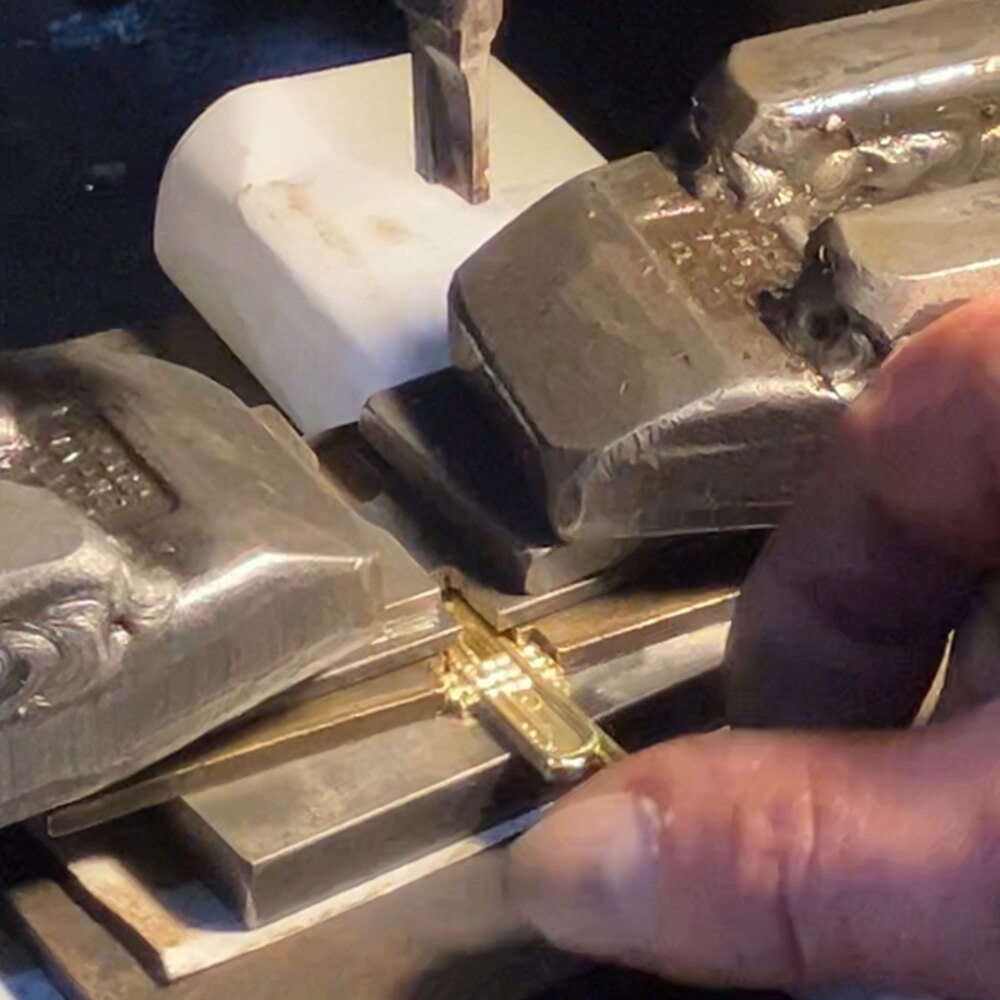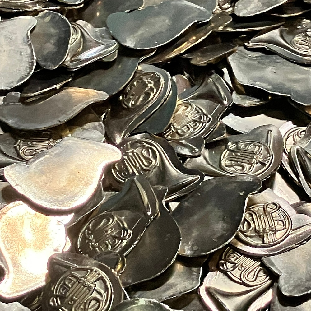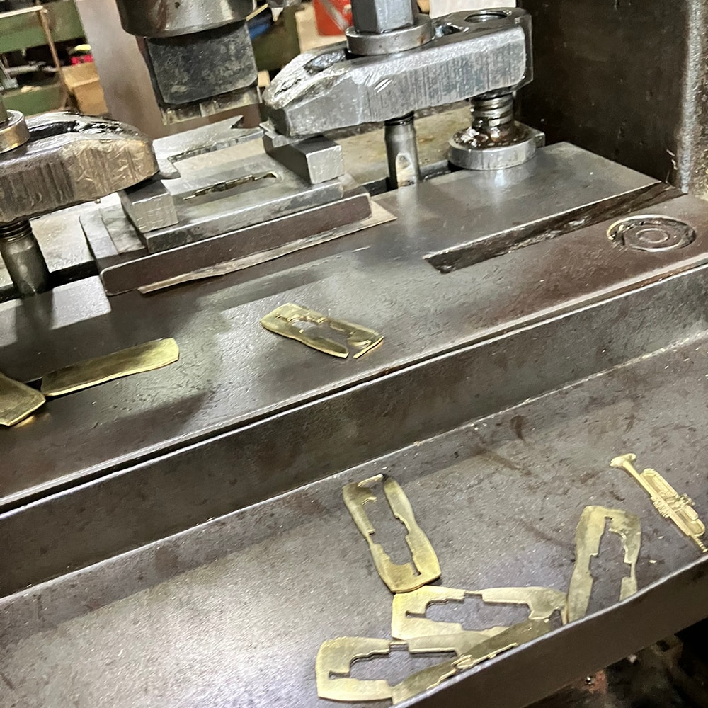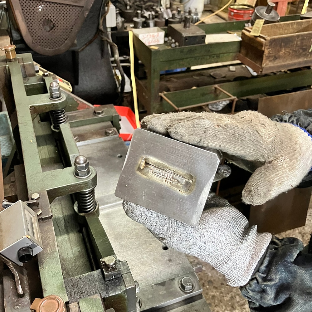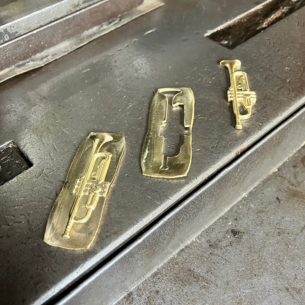 1. Cut a solid brass plate to create the press mold for the musical instrument motif.