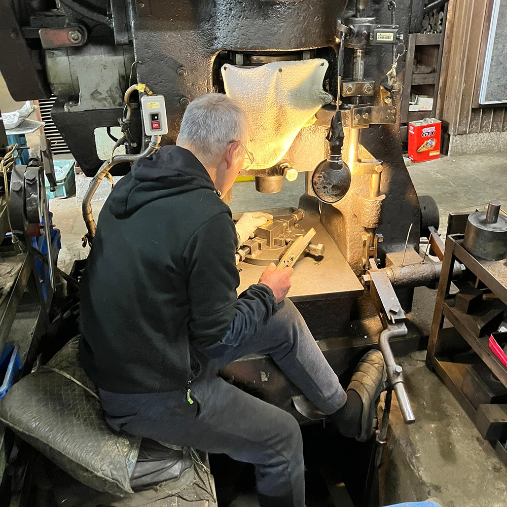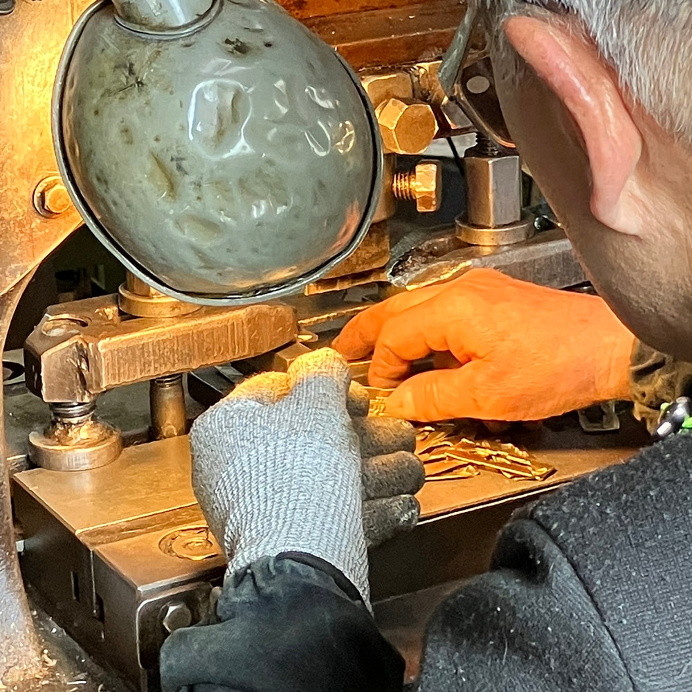 Pickboy musical instrument keychains are handmade in a small father-and-son workshop located in the traditional downtown area of Tokyo. I recently visited the workshop to capture these images. The craftsman you see in the photos has been making Pickboy keychains for over 50 years. Even today, they continue to use vintage machinery and traditional techniques to produce each piece by hand.